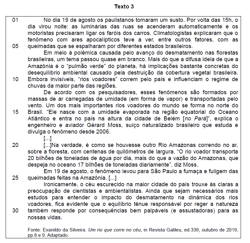 Analise as proposições em relação ao Texto 3, e assinale (V) para verdadeira e (F) para falsa. ( ) O verbo virar possui diversas regências, variando-as conforme o sentido que ele é empregado. No período “o dia virou noite” (linhas 1 e 2), foi empregado na acepção de transformar-se em, portanto, é um verbo de ligação e o substantivo noite tem a função sintática de predicativo do sujeito. ( ) A pontuação, na Língua Portuguesa, tem, entre muitas, a finalidade de assinalar pausas, esclarecer períodos, separar palavras. Em: “o dia virou noite: as luminárias das ruas se acenderam automaticamente” (linhas 1 e 2) os dois pontos foram usados para interromper a ideia expressa anteriormente. ( ) É correto afirmar que o autor do texto mantém distância em relação aos fatos narrados, porque não há comprovação de que os “rios voadores” fazem parte do território nacional. ( ) Da leitura do texto, subentende-se que as queimadas e o desmatamento da Amazônia prejudicam a formação dos “rios voadores” que jorram suas águas por todo o território nacional. ( ) Nos segmentos “fenômeno com ares apocalípticos” (linha 4) e “Mais do que a difusa ideia” (linha 7), se as palavras destacadas forem substituídas, na sequência, por obscuros e disseminada, a coerência e o sentido, no texto, são mantidos. Assinale a alternativa correta, de cima para baixo.