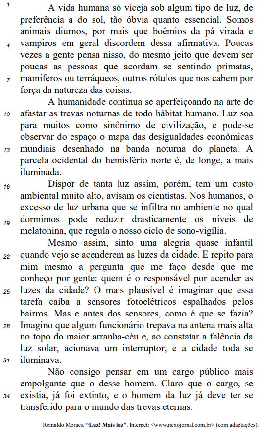 É correto inferir do trecho “o homem da luz já deve ter se transferido para o mundo das trevas eternas” (ℓ. 34 e 35) que provavelmente o funcionário responsável pelo acionamento da iluminação urbana já morreu.