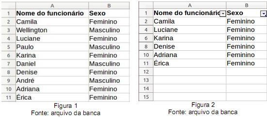 III. Filtragem. Exemplo: após criação do Autofiltro, clique sobre o botão que aparece no canto inferior direito da célula B1, desmarque o valor “Masculino" e clique em OK.