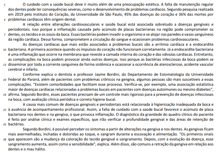 A flexão no plural do segmento “está associada” (linha 5) não prejudicaria a correção gramatical do texto, dada a referência do referido trecho a “alterações cardiovasculares e saúde bucal” (linha 5).