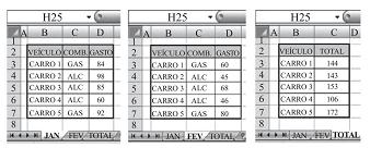 Na planilha TOTAL é mostrada a soma do consumo dos veiculos, identificado como GASTO,nos meses de janeiro (JAN) e fevereiro(FEV). Foi inserida uma fórmula na célula C3 da planilha TOTAL a fim de se obter a soma do gasto do CARRO 1 nos meses de janeiro e fevereiro, e o método arrastar foi utilizado para copiar a fórmula de C3 para as células C4, C5, C6 e C7. A fórmula inserida em C3 da planilha TOTAL foi