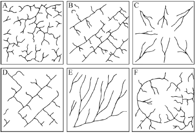 Na ordem de A para F, as bacias hidrográficas mostradas na figura em apreço correspondem, sucessivamente, às formas em treliça, dendrítica, anelar, retangular, paralela e radial.