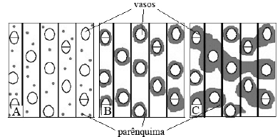 Com referência à figura precedente, que mostra esquemas de apresentação de tipos de parênquimas axiais que ocorrem nas espécies de madeiras, julgue o item a seguir.