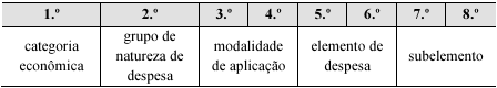 Nos quatro últimos dígitos do sistema de orçamento encontram-se o elemento e o subelemento das despesas, que indicam a movimentação financeira a ser executada por cota, quando ocorrer a liberação de recursos pelos órgãos setoriais de programação financeira, ou por repasse, no caso de liberação de recursos públicos de um Poder da República para outro.
