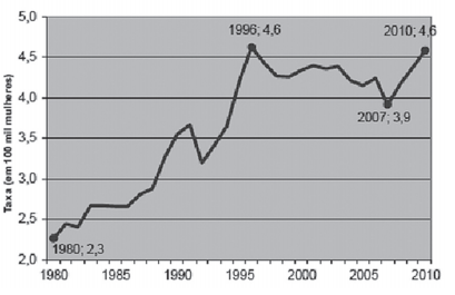 Notamos um crescimento até o ano de 1996, quando as taxas mantiveram alguma estabilidade até 2006. Neste ano, foi promulgada a lei Maria da Penha (lei 11.340/06), que, em seu primeiro ano de vigência, acompanhou uma queda no número desses casos. Logo a espiral de violência foi retomada, mostrando que só essa política não tem sido suficiente.