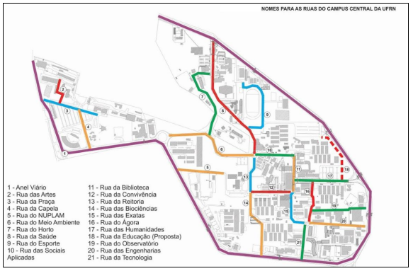 Observe a figura reproduzida a seguir que contém as ruas do Campus Central da UFRN.