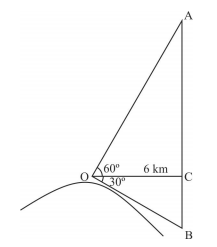 O esquema a seguir mostra um observador no ponto O, que representa o cume de uma montanha, e um avião no ponto A, à altura AB do solo. O ponto C, no segmento AB, está a 6 km desse observador.