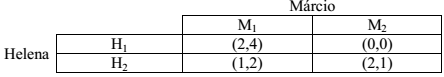 Considere o jogo abaixo entre Helena e Márcio, cada um com duas possíveis estratégias. Suponha que as duas pessoas tomem suas decisões simultaneamente.