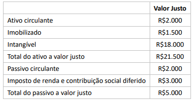 A empresa Alpha S.A. adquiriu, pelo valor de R$30.000, a empresa Beta S.A., sendo esse valor pago à vista. O Patrimônio Líquido da empresa Beta era de R$5.000. A empresa Alpha, por meio de avaliação de consultores externos, efetuou os estudos para determinação do valor justo dos ativos e passivos para a alocação do preço de compra, conforme demonstrado abaixo.