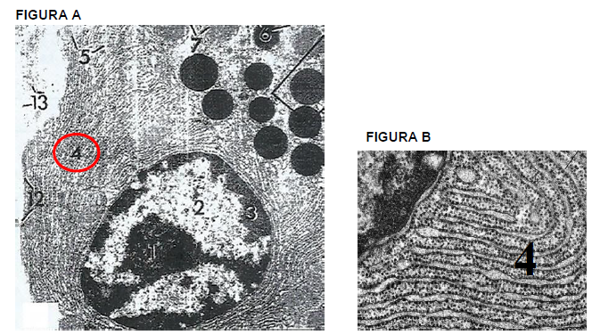Na Figura A temos uma micrografia eletrônica do pâncreas. Em destaque (no círculo indicado pelo número 4) vemos uma importante organela, a qual está ampliada na Figura B. Qual é essa organela e o que o desenvolvimento desta nos permite inferir quanto à atividade metabólica da célula?