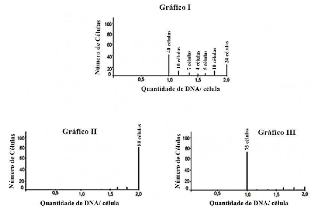 O perito utilizou o citômetro de fluxo para avaliar a quantidade de DNA em uma amostra de 100 células de uma cultura eucariótica. Esta cultura estava mantida em meio com condições normais para o desenvolvimento e crescimento celular. Os resultados desta análise foram plotados no gráfico I. Em seguida, o perito dividiu o restante da cultura em duas porções. Em uma delas, adicionou-se a colchicina (Gráfico II) e na outra afidicolina (Gráfico III), após algumas horas realizou-se a quantificação do DNA por célula, como observado nos gráficos. Considerando as informações citadas, marque a alternativa INCORRETA.