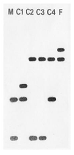 O IBAMA recebeu uma denúncia de que Sr. João mantinha em cativeiro exemplares de canários que haviam sido capturados na reserva florestal próxima a sua residência. Ao chegar à residência do Sr. João foram encontrados quatro canários todos identificados com anilhas, mas quando perguntado sobre onde fica o criadouro que os venderam, Sr. João se enrola. Desconfiados os fiscais coletam amostras de penas e levam ao laboratório para a comparação do DNA com os possíveis pais do criadouro indicado pelo Sr. João. Análise o fingerprint do possível pai (P), mãe (M) e dos canários (C1, C2, C3 e C4) e assinale a alternativa CORRETA.