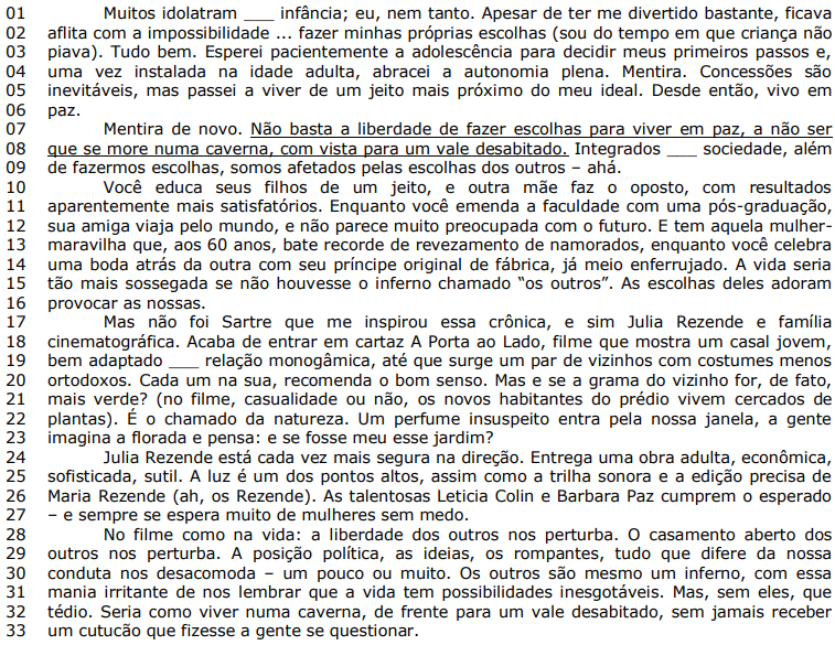 (Disponível em: https://gauchazh.clicrbs.com.br/donna/colunistas/martha-medeiros/noticia/2023/03/a-vidaseria-tao-mais-sossegada-se-nao-houvesse-o-inferno-chamado-os-outros-clf0b09nc003z017y2f2frg4y.html – texto adaptado especialmente para esta prova).