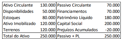 • seu estoque tinha valor justo de R$100.000. • seu terreno tinha valor justo de R$150.000. • seu passivo tinha valor de mercado de R$80.000.