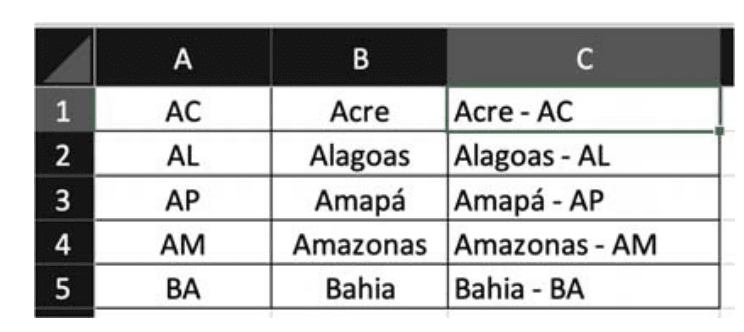 Se um usuário recebesse a planilha Excel a seguir somente com os dados contidos nas colunas A e B e necessitasse preencher a coluna C, em vez de digitar manualmente os dados, ele poderia, para fazer o referido preenchimento, digitar o conteúdo “Acre - AC” na célula C1; selecionar a célula C1; e acionar o botão "Preenchimento Relampâgo" na guia dados.