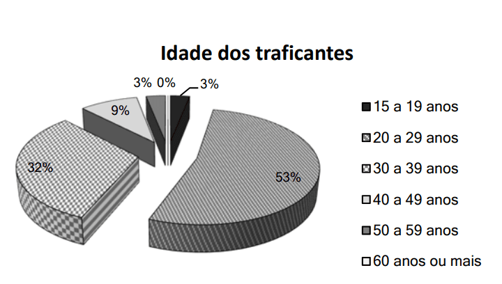 Considere que a Polícia Federal tenha registrado, em determinado período, a prisão de 1.789 traficantes de drogas pertencentes a facções criminosas, conforme faixas etárias mostradas no gráfico. Com referência às informações e ao gráfico precedentes, julgue o item subsecutivo.