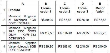 - Fazer um orçamento dos pentes de memória abaixo usando uma planilha contendo o preço apresentado por 3 fornecedores e apontar o menor preço dentre