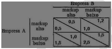 Duas empresas, “A” e “B”, tentam um acordo comercial para atuarem numa parceria público-privada. Ambas fixam preço através de markup sobre o custo médio e podem escolher entre adoção de “ markup baixo ” ou “ markup alto ”, em que cada estratégia está associada a um prêmio (R$ milhões), como demonstrado na matriz abaixo: