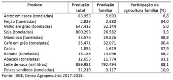 Considerando a tabela precedente, que mostra os dados da produção da agricultura familiar no Censo Agropecuário 2017-2018, julgue o item a seguir.