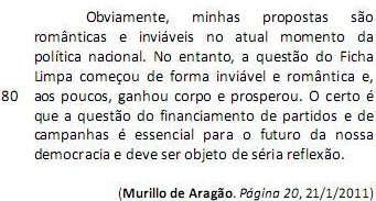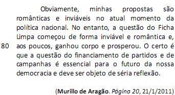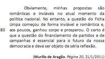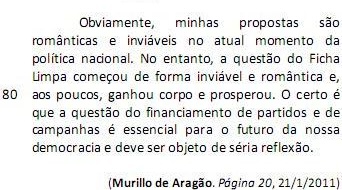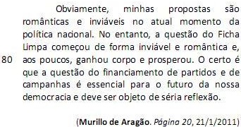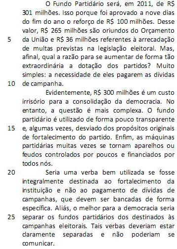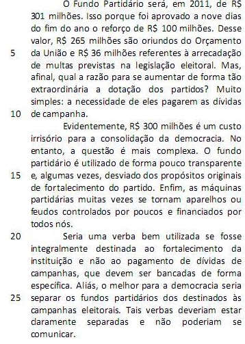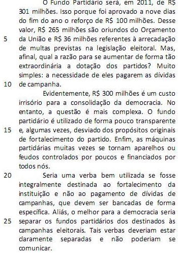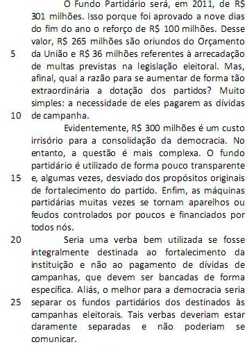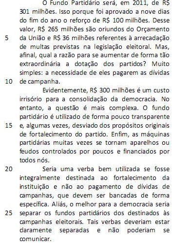 O Fundo Partidário será, em 2011, de R$ 301 milhões. Isso porque foi aprovado a nove dias do fim do ano o reforço de R$ 100 milhões. Desse valor, R$ 265 milhões são oriundos do Orçamento da União e R$ 36 milhões referentes à arrecadação de multas previstas na legislação eleitoral. Mas, afinal, qual a razão para se aumentar de forma tão extraordinária a dotação dos partidos? Muito simples: a necessidade de eles pagarem as dívidas de campanha. (L.1-10)