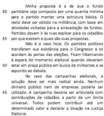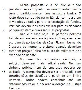 Minha proposta é a de que o fundo partidário seja composto por uma quantia mínima para o partido manter uma estrutura básica. (L.29-31)