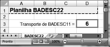 As planilhas BADESC11 e BADESC22 foram criadas no Excel 2007 BR. Na BADESC11, em D5 foi inserida uma expressão para determinar a soma entre os números contidos nas células A3 e C3 e, em D7 a função =MOD(D5;8). Para finalizar, foi inserida uma fórmula para transportar o conteúdo de D7 da planilha BADESC11 para a célula D3 na planilha BADESC22.