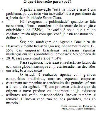 O segundo parágrafo do texto poderia ser corretamete reescrito da seguinte forma: Existe “exageros na publicidade” quando se menciona esse assunto, diz o coordenador do centro de inovação e criatividade da ESPM: “inovação é só aquilo que elimina conforto, altera algo com que a pessoa já esteja acostumado”, define ele.