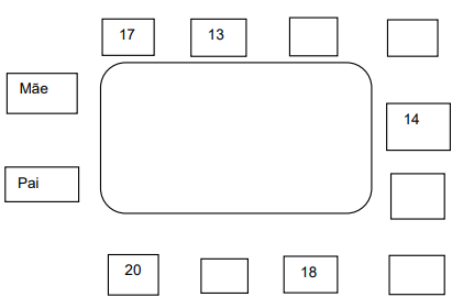 Um grupo de 10 adolescentes chega a uma festa na casa de um deles e cada um recebe um cartão. Cada um dos cartões contém um número diferente, escolhido entre os números naturais de 11 até 20. Os adolescentes devem se arrumar em torno de uma mesa, como ilustrado a seguir. Em certo momento, cinco lugares da mesa, além dos lugares ocupados pelo pai e mãe de um deles, já estão ocupados, e os outros cinco serão ocupados pelos adolescentes restantes, de modo que a soma dos números dos cartões de quaisquer quatro lugares que estejam alinhados seja 61.