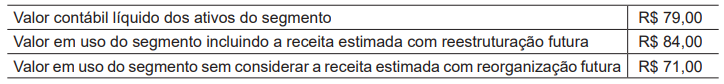 Uma companhia opera no mercado de petróleo e gás, e suas atividades estão organizadas em três segmentos operacionais. A partir da análise de relatórios internos de desempenho, a companhia decidiu realizar um teste de recuperabilidade de um dos segmentos, para o qual não há mercado de venda ativo. Os valores dispostos na Tabela abaixo estão expressos em milhões de reais.