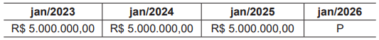 Uma empresa montou uma estratégia financeira que consiste em fazer 4 aportes anuais em uma mesma modalidade de investimento, a juros compostos pré-fixados de 10% ao ano, no período de 2023 a 2026. A previsão é de que os aportes anuais, nesse período, sejam realizados sempre em janeiro de cada ano, conforme mostrado na Tabela a seguir.