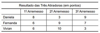 Em uma gincana, três amigas competiram arremessando dardos em um alvo que apresentava dez regiões com pontos de 1 a 10. Segue a tabela que mostra os pontos obtidos por elas em três arremessos.