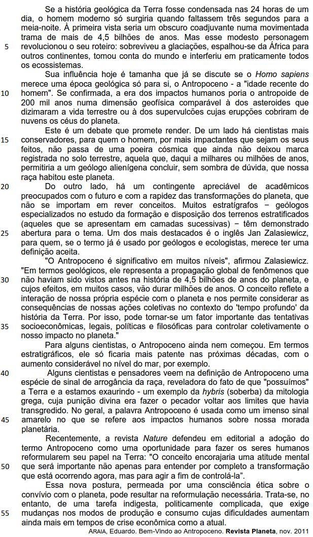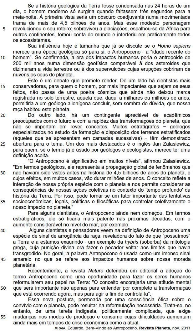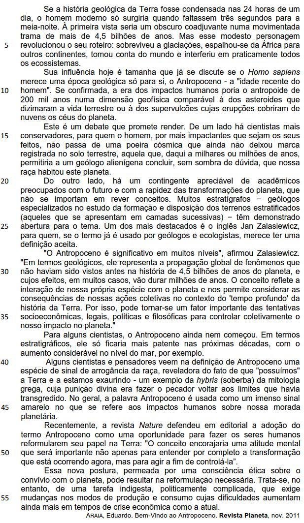 Se a história geológica da Terra fosse condensada nas 24 horas de um dia, o homem moderno só surgiria quando faltassem três segundos para a meia-noite. (linhas 1-3)