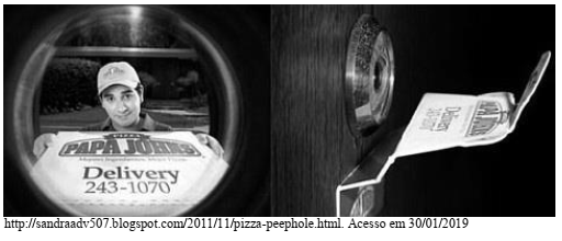 A propaganda acima usa como recursos expressivos a linguagem verbal e a não verbal. O intuito é levar o interlocutor a crer que há de fato um entregador de pizza à porta, quando na verdade trata-se apenas da propaganda. Assim, podemos concluir o seguinte:
