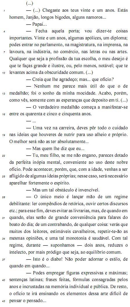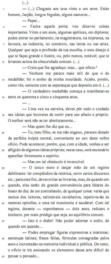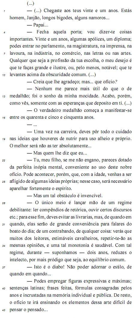 No diálogo apresentado, entre o personagem Janjão e seu pai, a fala inicial é introdutória do assunto e indica a surpresa do pai diante da maturidade de seu filho e o tom solene que irá permear a conversa em que o pai aconselha o filho a avaliar criticamente os valores da sociedade da época, o que torna o texto de Machado de Assis ainda adequado à atualidade.