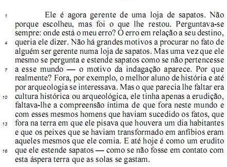 No segmento “mas foi o que lhe restou” (l.2), a referência do pronome “o” é a expressão nominal “uma loja de sapatos” (l.1), e a do pronome “lhe” é o substantivo “gerente” (l.1).