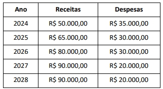 Em 2023, uma universidade tradicional que, até então, só ofertava cursos presenciais de graduação, resolveu se arriscar em um novo projeto. Tratava-se da abertura de seu primeiro curso 100% à distância a ser disponibilizado ao mercado. Para tal, ainda em 2023, foram investidos R$ 100.000,00 para a estruturação do referido curso. Além disso, foram estimadas despesas e receitas anuais conforme dados apresentados na sequência: