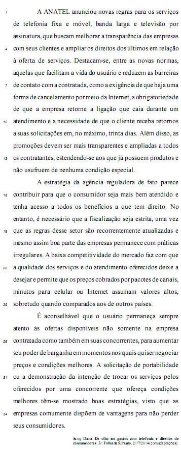 As orações “para que o consumidor seja mais bem atendido” (l.16) e “para não perder seus consumidores” (l. 34 e 35) estabelecem relação de finalidade com as orações “A estratégia da agência reguladora de fato parece contribuir” (l. 15 e 16) e “as empresas comumente dispõem de vantagens” (l. 33 e 34), respectivamente.