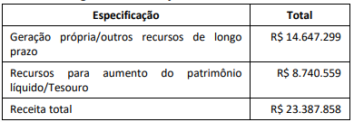“Artigo 6º A receita do Orçamento de Investimento das Empresas é estimada em R$ 23.387.858,00 (vinte e três milhões, trezentos e oitenta e sete mil, oitocentos e cinquenta e oito reais), decorrerá da transferência de recursos do Tesouro do Estado e da geração de recursos próprios, conforme a seguinte classificação”:
