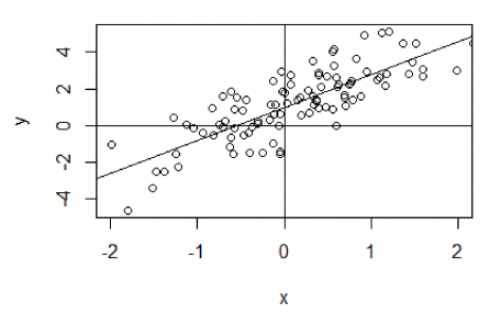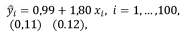 Considere o modelo de regressão linear com erros normais definidos pela equação de regressão yt = a + bxi + ei, em que yixi denotam, respectivamente, a variável resposta e o regressor associados à í-ésima observação, sendo ei o í-ésimo erro aleatório, i = 1, ...,n, com n = 100. O gráfico de dispersão a seguir foi extraído de uma base de dados simulada em conformidade com este modelo.