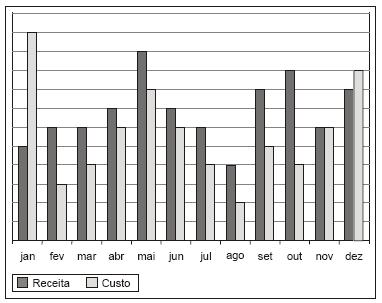 O gráfico mostra as receitas que uma empresa conseguiu em cada mês de um ano, além dos custos que ela teve nos respectivos meses.