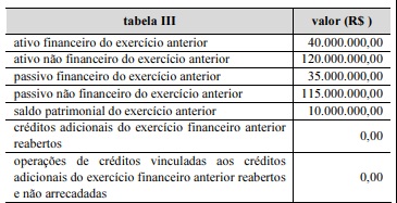 Ainda considerando as informações das tabelas I, II e III apresentadas, julgue o item que se segue, em relação à demonstração das variações patrimoniais e ao balanço patrimonial do município. O superávit financeiro do exercício financeiro anterior foi de R$ 5.000.000.