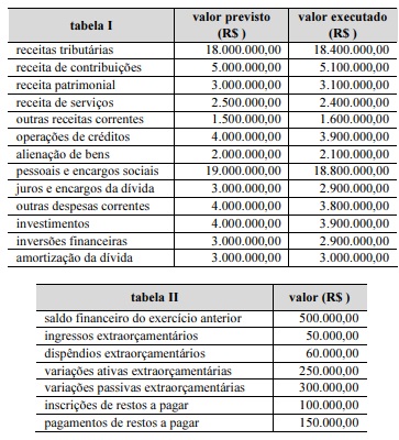 A partir das informações apresentadas e das tabelas I, II e III, julgue o item a seguir no que diz respeito ao balanço orçamentário do município. O resultado orçamentário ao final do exercício foi de R$ 1.300.000.