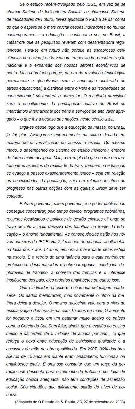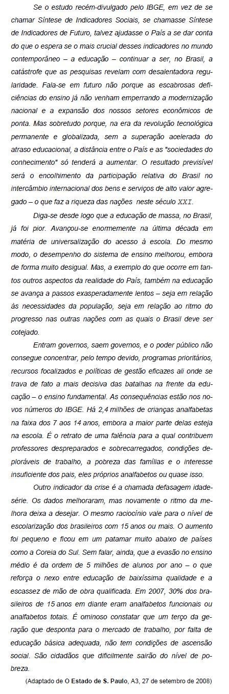 Fala-se em futuro não porque as escabrosas deficiências do ensino já não venham emperrando a modernização nacional e a expansão dos nossos setores econômicos de ponta. Mas sobretudo porque, na era da revolução tecnológica permanente e globalizada, sem a superação acelerada do atraso educacional, a distância entre o País e as "sociedades do conhecimento" só tenderá a aumentar. (1 o parágrafo)