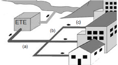 A figura acima representa um trecho de rede coletora de esgotos de um município e a condução dessa rede até a estação de tratamento de esgotos (ETE). O tratamento realizado nessa ETE ocorre pelo processo de lodos ativados. Todos os trechos apresentados no esquema trabalham como condutos livres, por gravidade, com a vazão afluente máxima de 200 L/s. Nessa ocasião, o trecho (a), de diâmetro de 250 mm, trabalha a meia seção. Com base nessas informações, julgue o item a seguir. O trecho (a), denominado emissário, recebe contribuição na sua extremidade de montante.