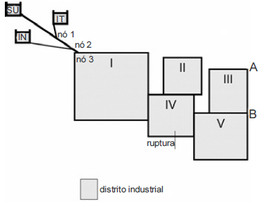 Um distrito industrial é abastecido por diversas fontes de água. A condução da água dessas fontes é direcionada a três reservatórios: um superior (SU), um intermediário (IT) e um inferior (IN), que abastecem o distrito industrial por meio de uma rede fechada em anéis, de acordo com o esquema apresentado acima. A respeito do funcionamento hidráulico desse sistema de abastecimento, julgue o item seguinte. Se ocorrer uma ruptura na canalização do anel IV, na seção indicada, e um curto trecho for isolado para que seja realizado o serviço de manutenção, mesmo durante esse procedimento permanecerá inalterada a garantia de abastecimento do trecho entre A e B do anel III.