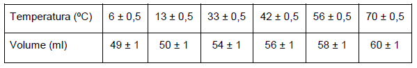 Segundo a lei de Charles, a relação entre o volume e a temperatura, à pressão constante, é linear: V = kT. De acordo com os dados da tabela, o valor dessa constante k, em ml/K, é aproximadamente: