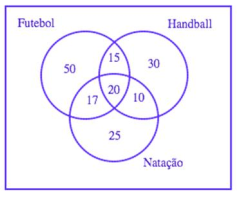 Uma escola está fazendo o levantamento da quantidade de alunos que praticam esportes, a fim de organizar um campeonato. Dentre os esportes praticados por alunos, os de maior prática são futebol, handball e natação. O resultado da pesquisa está indicado no diagrama abaixo, onde os números simbolizam as quantidades de alunos que praticam os esportes mencionados.