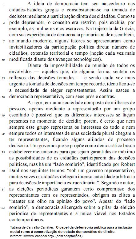 Tatiana de Carvalho Camilher. O papel da defensoria pública para a inclusão social rumo à concretização do estado democrático de direito. Internet: (com adaptações).
