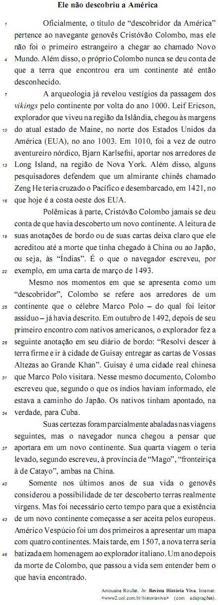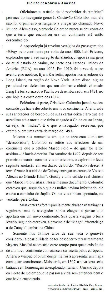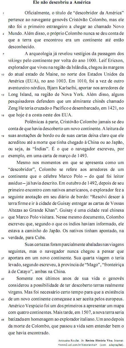 No período “Um ano depois da morte de Colombo, que passou a vida sem entender bem o que havia encontrado” (l.46-48), a vírgula, empregada para separar o sujeito do predicado, torna mais claras as informações para o leitor.