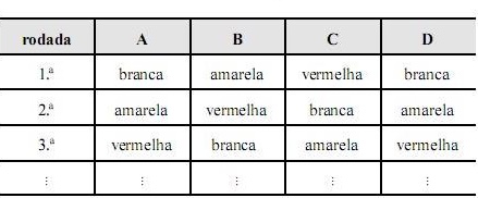 Para apostar em um jogo de cartas, os amigos A, B, C e D receberam fichas de 3 cores diferentes, na sequência mostrada na tabela acima. A partir dessas informações e dos dados apresentados na tabela, julgue os itens que se seguem.